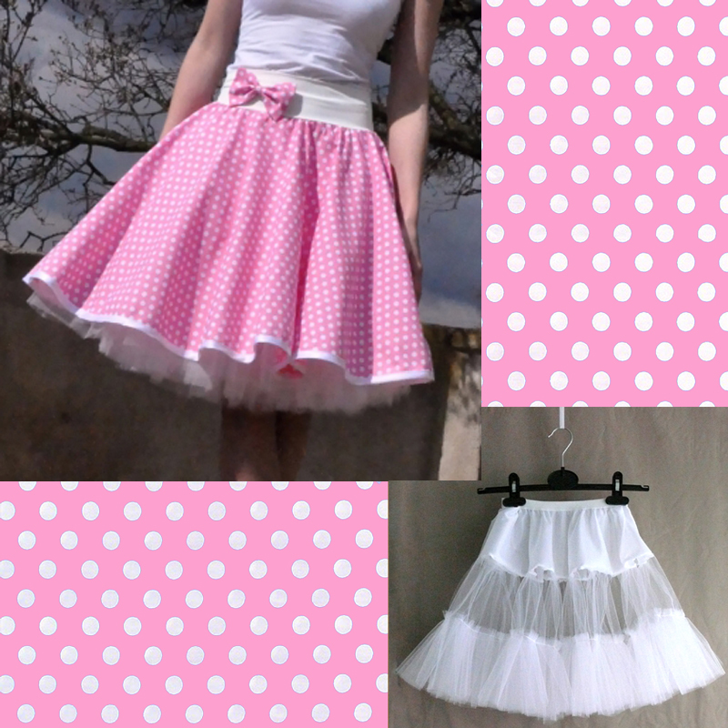 Světle růžová puntíkovaná sukně + jednoduchá bílá spodnička