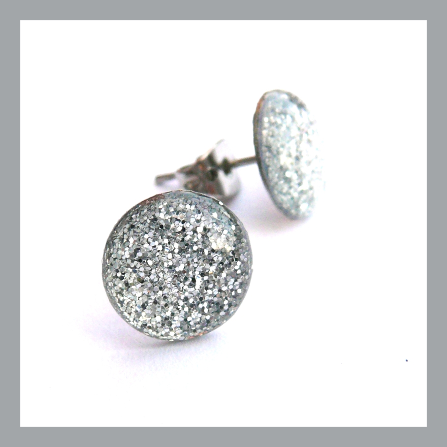Drobné náušničky mají průměr 1 cm. Stříbrný třpytivý podklad je zalitý dostatečnou vrstvou kvalitní křišťálové pryskyřice, která vytváří pravidelný kopeček. Je průzračná, lesklá a samozřejmě bez bublinek a nečistot.