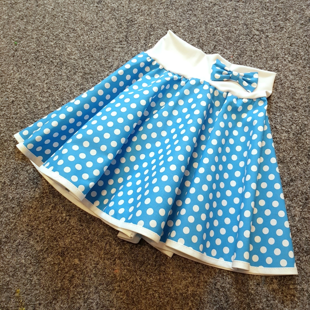 Sukně v retro stylu je ušitá z puntíkované bavlněné látky - tyrkysově modrý podklad a bílé puntíky o velikosti 1 cm. Je kolová a má bílý pružný pasový límec, který se dobře přizpůsobí a je velmi pohodlný. Spodní okraj je bíle olemovaný. K sukni navíc dostanete mašličku jako sponku do vlasů.