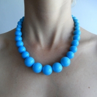 Tyrkysově modré korále v retro stylu o průměu 1 - 1,8 cm jsou navlečené na gumičce. Náhrdelník má v klidu délku 54 cm a díky své pružnosti se dá snadno navléci na krk.