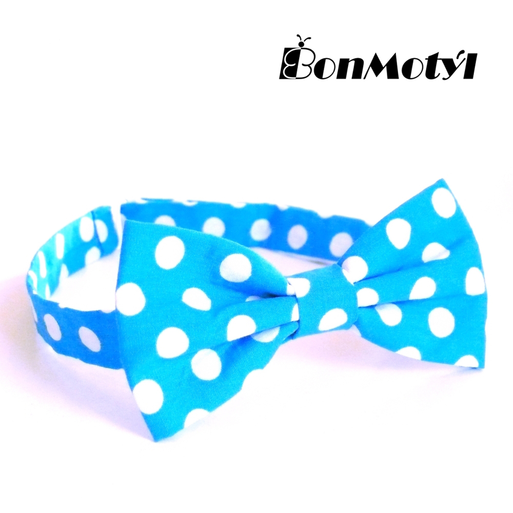 Pánský motýlek je ušitý z bavlnené látky - tyrkysově modré s puntíky velkými cca 1 cm.