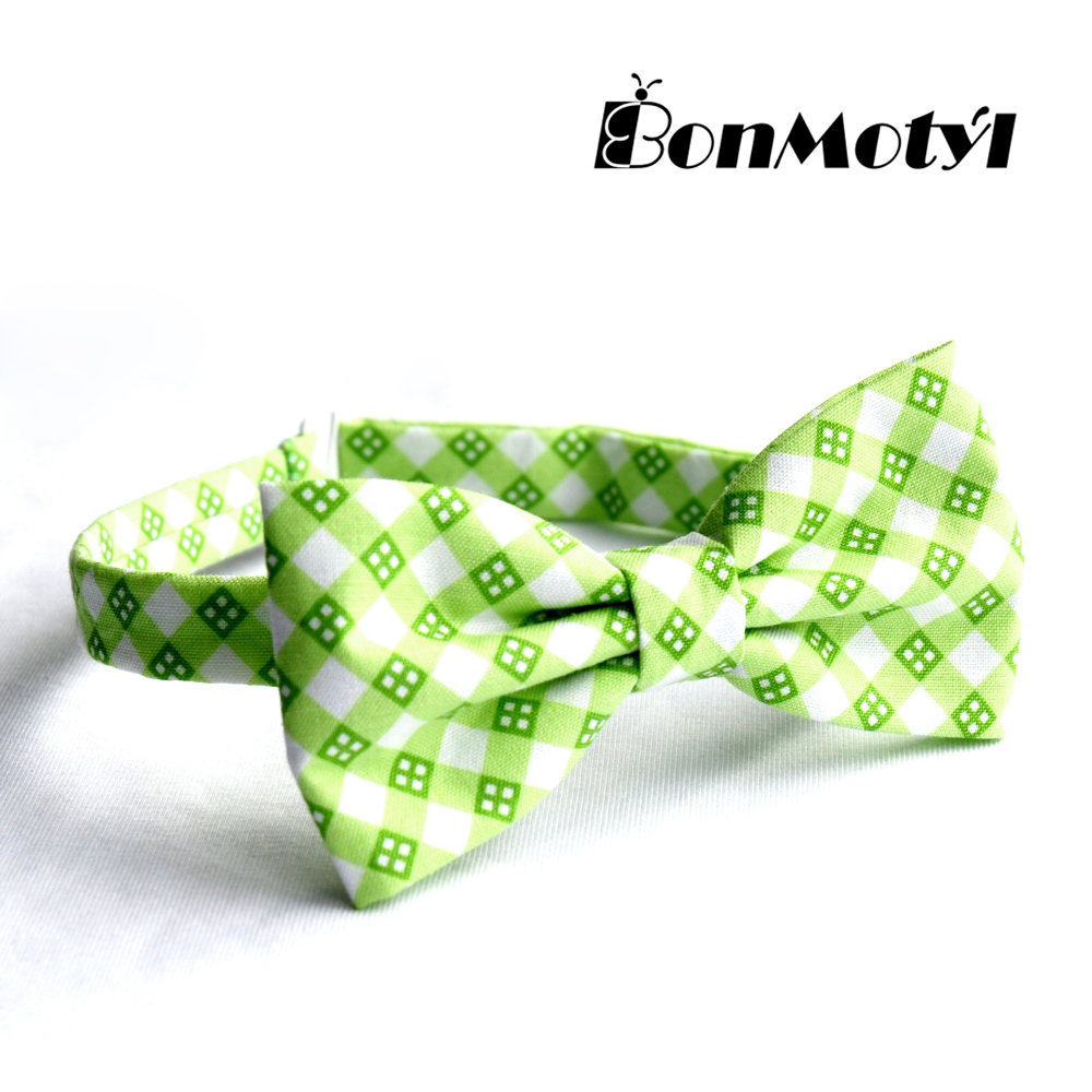 Pánský motýlek je ušitý z bavlněné látky - světle zelené s károváním.