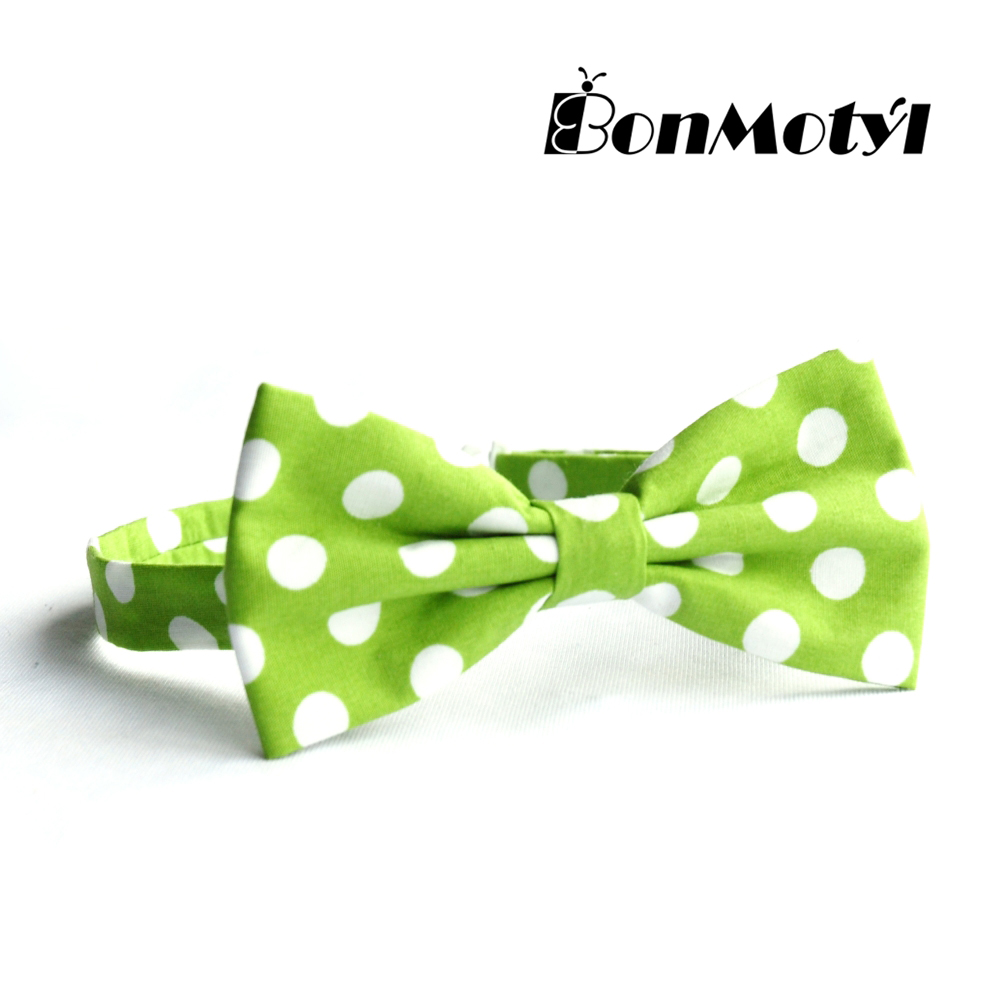 Pánský motýlek je ušitý z bavlněné látky - světle zelené s bílými puntíky.