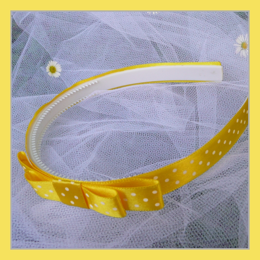 Žlutá čelenka s bílými puntíky má mašlí velkou cca 8 cm. Šířka čelenky je 1,2 cm.
