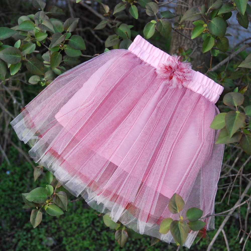 Sukně je ušitá z několika vrstev nařaseného světle růžového a tmavě červeného tylu, podšitá je světle růžovou látkou, která však pod vrstvou tylu není téměř patrná, takže sukně vytváří dojem, jakoby byla celá jen z lehounkého tylu. Tyl i podšívka jsou všité do pasového límce, který má v sobě gumu, takže sukně je velikostně velmi přizpůsobivá. Na pasovém límci je mašlička. Sukně na fotografii má následující míry: Výška pasového límce: cca 3 cm Délka tylové části: cca 23 cm Minimální obvod v pase (aby sukně nepadala): 36 cm Maximální obvod přes boky (aby bylo možné sukni obléknout): 52 cm