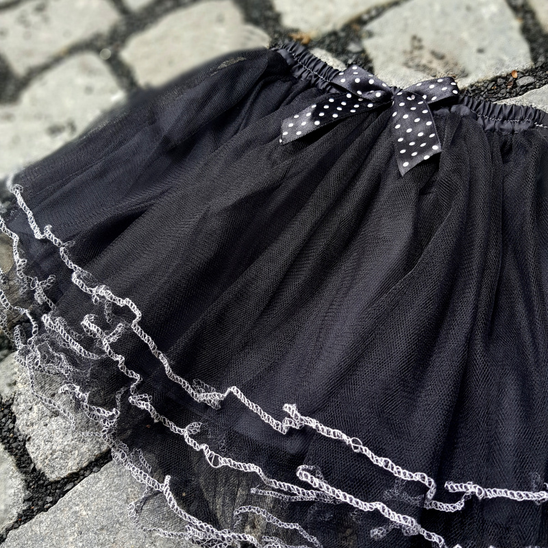 Sukně je ušitá z několika vrstev nařaseného černého tylu, podšitá je stejně barevnou látkou, která však pod vrstvou tylu není téměř patrná, takže sukně vytváří dojem, jakoby byla celá jen z lehounkého tylu a zároveň není průhledná. Okraje tylu jsou bíle olemované, sukně je ozdobená puntíkovanou mašličkou. Tyl i podšívka jsou všité do pasového límce, který má v sobě gumu, takže sukně je velikostně velmi přizpůsobivá. Sukně na fotografii má následující míry: Výška pasového límce: cca 2,5 cm Délka tylové části: cca 26 cm Minimální obvod v pase (aby sukně nepadala): 48 cm Maximální obvod přes boky (aby bylo možné sukni obléknout): 80 cm