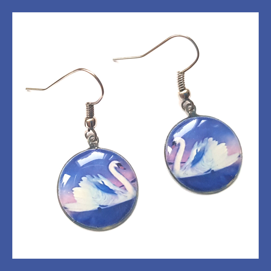 Náušnice s labutěmi mají průměr 1,8 cm. Motiv je zalitý dostatečnou vrstvou kvalitní křišťálové pryskyřice, která vytváří pravidelný kopeček. Je průzračná, lesklá a samozřejmě bez bublinek a nečistot.