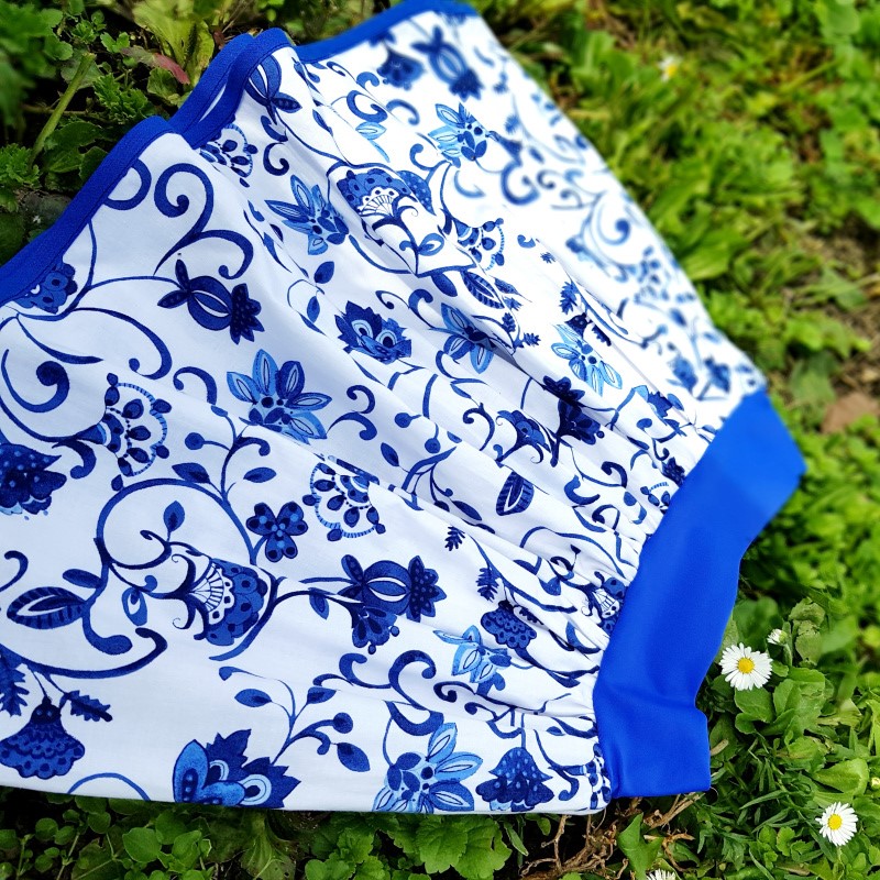 Sukně je ušitá z bavlněné látky - bílé s modrými kytičkami v lidovém stylu. V pase má modrý pasový límec, který se přizpůsobí a je velmi pohodlný. Spodní okraj je modře olemovaný. Sukně má následující míry: Délka bavlněné části: cca 30 cm Šířka pasového límce: cca 6 cm Minimální obvod v místě pasového límce: 60 cm (jinak by sukně padala, větší obvod nevadí, pasový límec je hodně pružný) Maximální obvod přes boky: 90 cm (v případě většího obvodu by nebylo možné sukni obléknout) Odpovídá přibližně velikosti 104-128. |